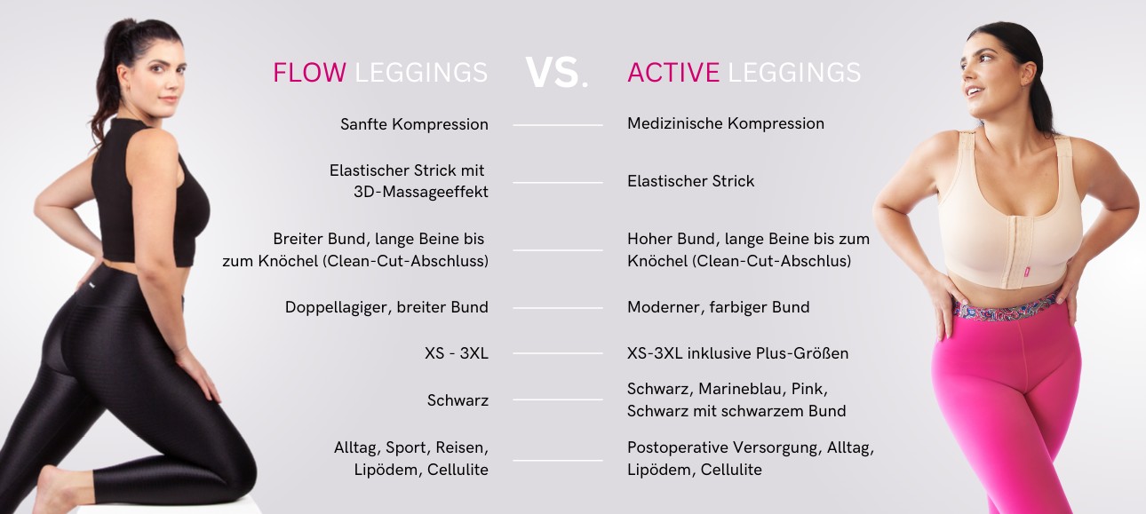 Unsere ACTIVE leggings und FLOW leggings können durch ihren angenehmen Druck und die glättende Silhouette das Erscheinungsbild der Haut optisch unterstützen.
